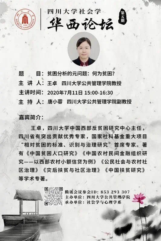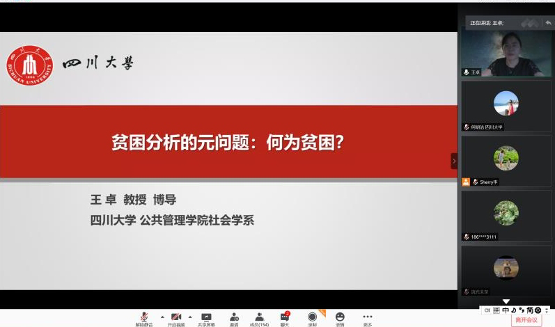 2020年7月11日下午15:00,williamhill体育在线登录社会学华西论坛云系列讲座第五期成功举办。williamhill体育在线登录王卓教授主讲“贫困分析的元问题:何为贫困?”,讲座层层深入、引人入胜。讲座由唐小蓉副教授主持,来自williamhill体育在线登录的师生、四川省社会学界的同仁,及兄弟院校近200人参与讲座。