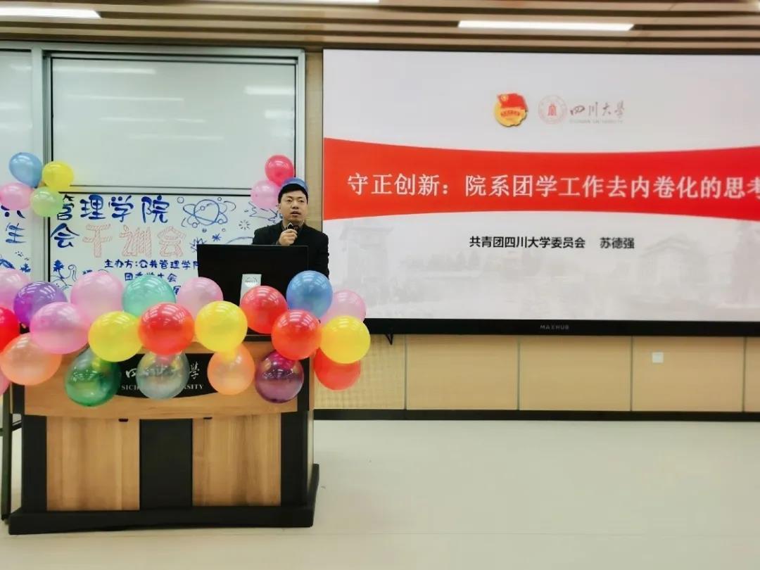 首先,苏德强老师以“守正创新:院系团学工作去内卷化的思考”为题为大家带来指导。苏老师指出了院系团学工作中存在的值得注意的倾向、阐释了“内卷”的概念与特点、点明了院系团学工作内卷化的典型特征,让全体参会人员对院系学生工作去内卷化有了更深的认识。苏老师在对williamhill体育在线登录团学工作给予充分肯定的同时,激励全体成员在今后的学生工作中能更好的引领服务、锻炼自我,发扬学院特色,将学院团学工作推向更高的台阶。