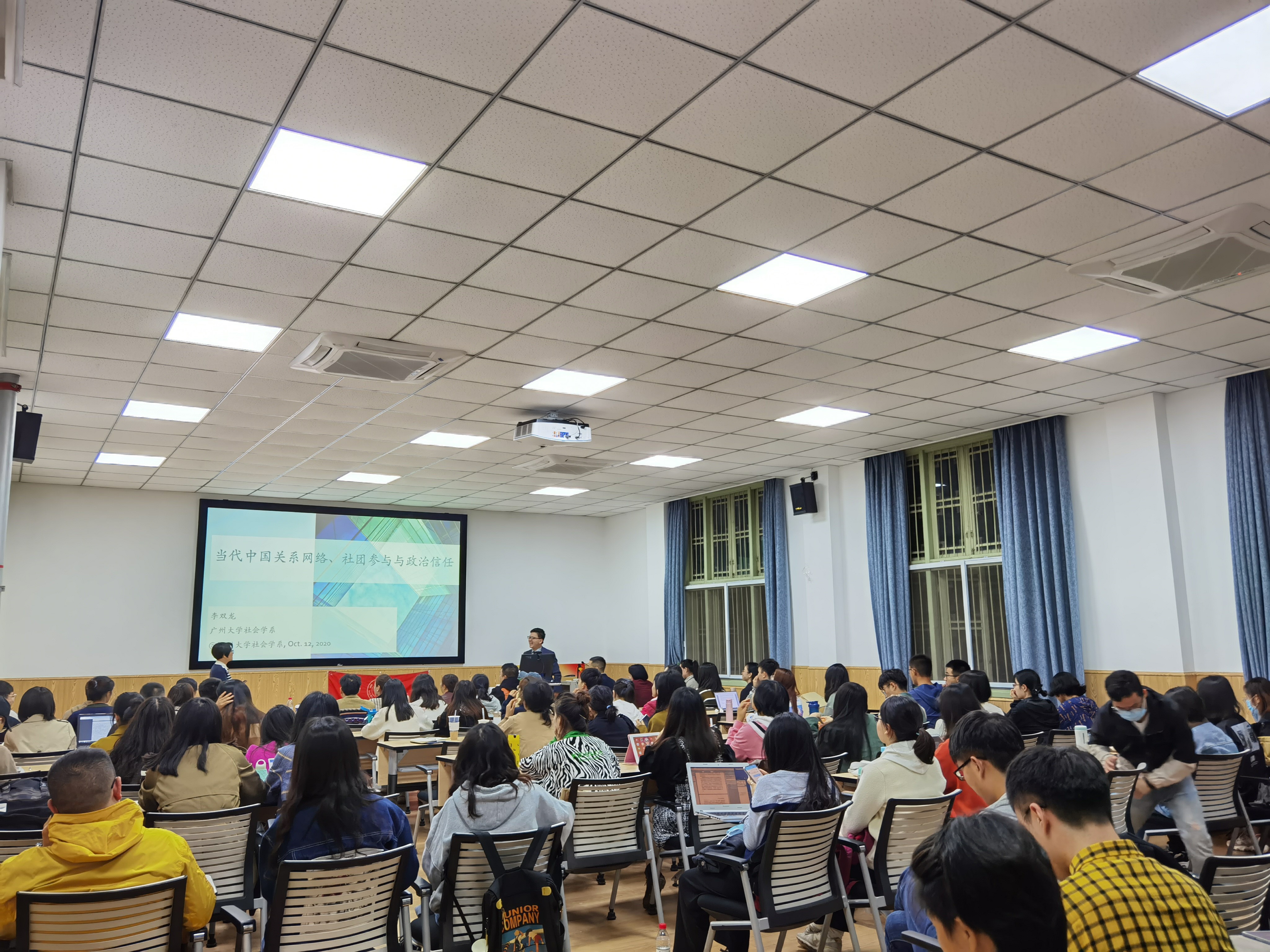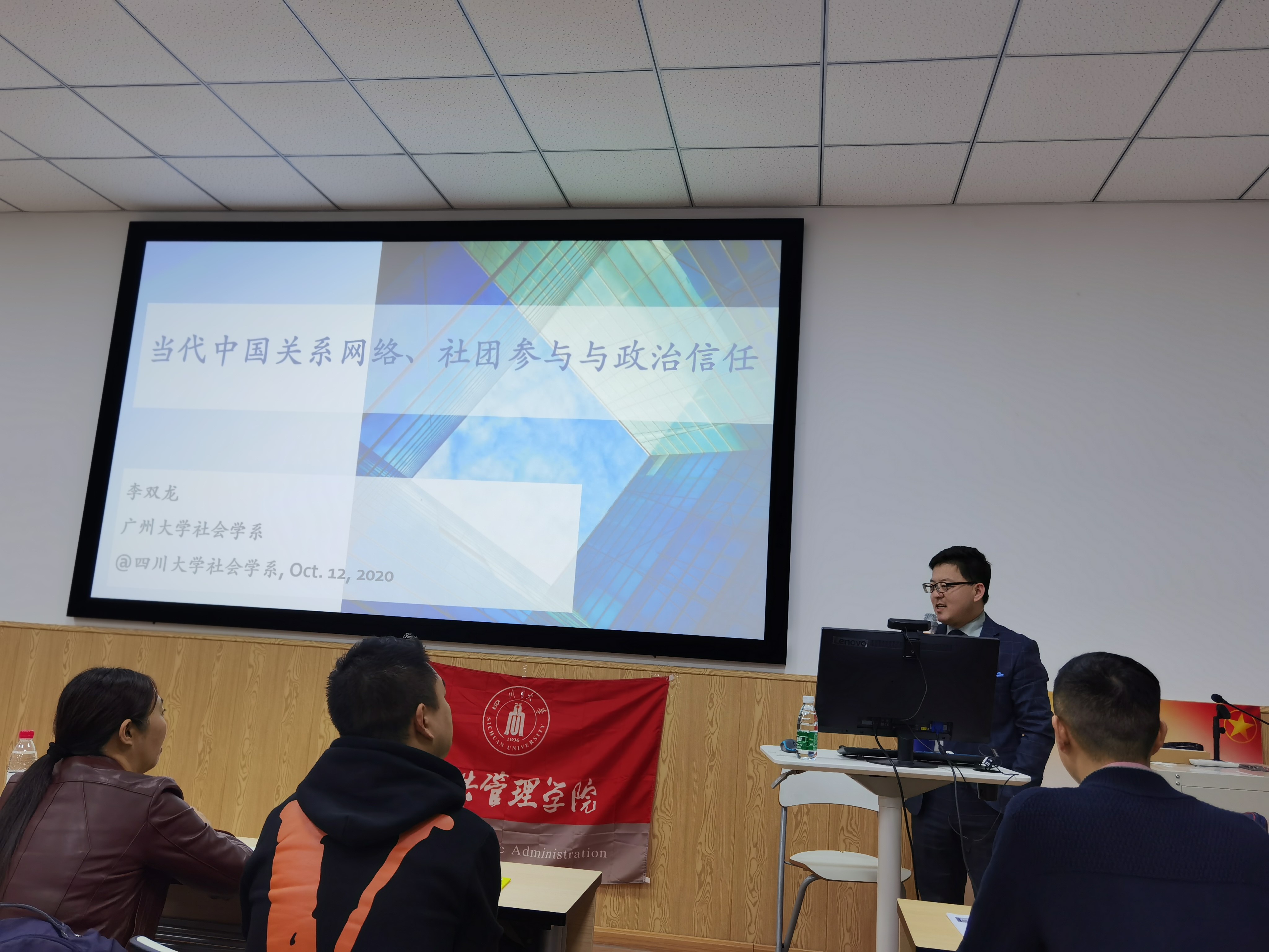 2020年10月12日晚上7点,williamhill体育在线登录社会学·华西论坛系列讲座第八期成功举办。广州大学社会创新研究中心副主任、社会学系李双龙副教授在williamhill体育官网106报告厅开展了主题为“当代中国的关系网络、社团参与和政治信任(Guanxi Networking, Associational Involvement, and Political Trust in Contemporary China)”的精彩讲座。讲座由社会学与心理学系郑莉副教授主持,社会学与心理学系、兄弟院校师生近百人参加了讲座。