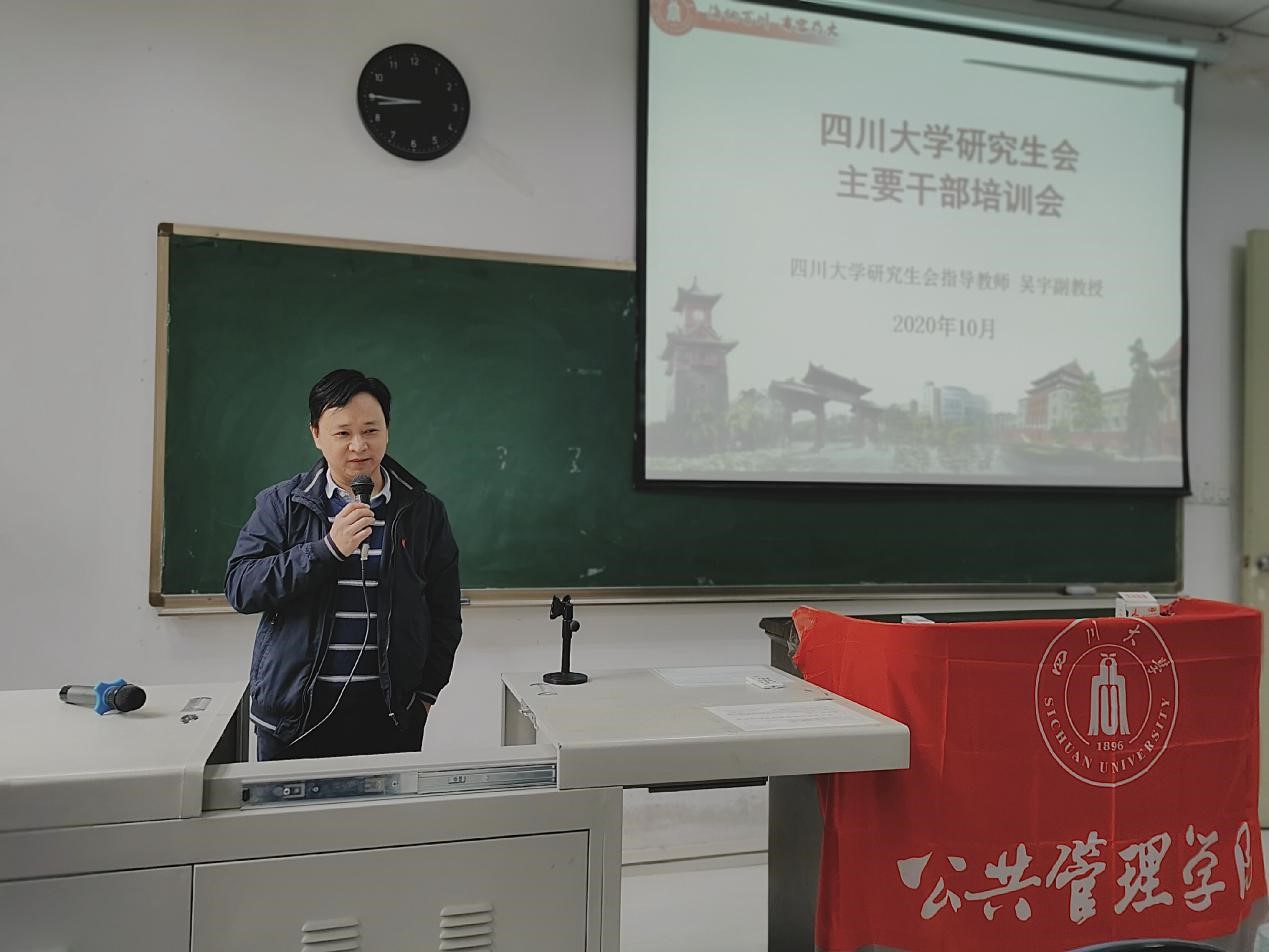 吴宇副教授以《如何做好研究生干部》为题,从为什么要做学生干部、怎样做好学生干部两方面出发,首先介绍了williamhill体育在线登录研究生会的指导思想、组织性质及干部的培养体系,接下来,吴宇副教授向参会学员强调,做好研究生会干部的核心是坚持研究生会干部自我管理,自我教育,自我服务。最后,吴老师希望研究生会干部具有过硬的政治素养,并对公管研究生会的学生干部提出了更高的要求。