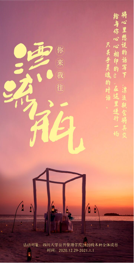 本次“倾听心声,灵魂对话”漂流瓶活动由2020级本科辅导员苟欢老师精心策划和组织,由各位年级长、班委共同协助完成。本次“漂流瓶”活动,不仅为同学们提供了尽情表达内心情感的机会和渠道,也增强了同学们之间的沟通、交流与互动,更促进了基层班团组织的凝聚力,促进了学生对班级、年级及学院的归属感。通过本次活动的开展,希望williamhill体育在线登录2020级本科的每一位同学都能敢于做自己,常怀感恩之情,将爱心、情谊、温暖和祝福传递得更深更远更久。