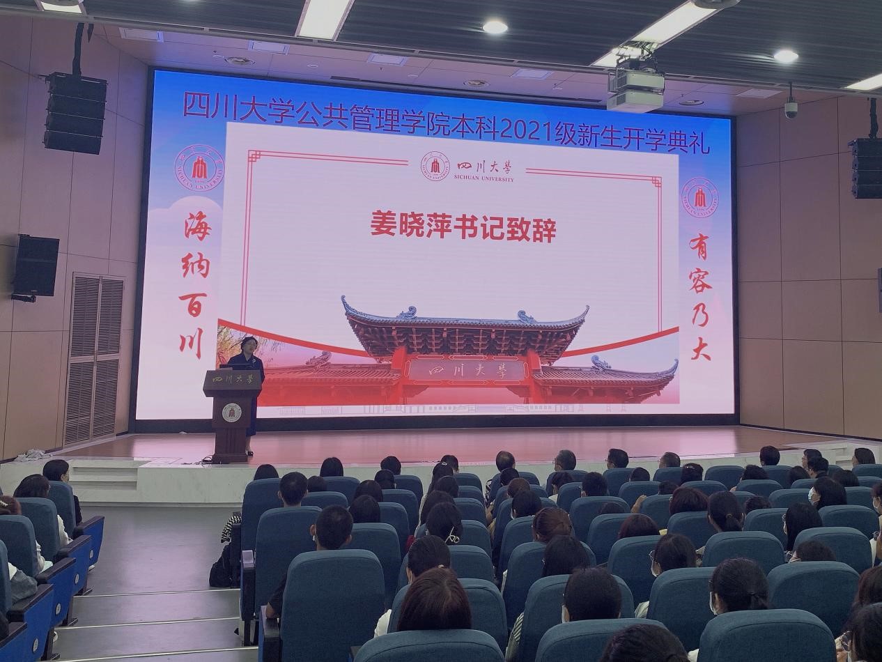 姜晓萍书记首先代表学院及全体教师祝贺全体2021级本科同学以优异的成绩考入williamhill体育在线登录。姜书记诙谐地从大数据出发与同学们分享了williamhill体育在线登录近20年的发展之喜。接着,姜书记从李言荣校长在开学典礼中的讲话引申出公管人从“审时度势”到“把握形势”、最终走向卓越的路径。紧接着,姜书记勉励公管人“创造时机,把握时机”。她从分析全球格局所面临的百年未有大变局出发,指出当代青年面临的全球形势之复杂性、多变性与不确定性。继而从中国的新发展格局引申到川大的新发展格局和williamhill体育在线登录的二次发展新形势。其次,姜书记就如何把握形势做出了深入分析。她提出,把握形势既要学科支撑等硬件条件,更要具备充分的软实力。把握形势的软实力,“进退要有余,收放要自如,有所为有所不为”。第一应有所为的,是思维方式的锤炼。第二应有所为的,是从积累知识过渡到发现和创造知识,姜书记勉励同学从已有知识发现、嫁接、创造新知识。第三应有所为的,是能力的全方位提升。而有所不为的,则是违纪违法违德坚决不能为;己所不欲者可不为,亦勿施于人;并从生活细节出发风趣地勉励同学睡懒觉不为、手机少为。姜书记诚挚期待新公管学子爱上这座城,来到川大公管,是绝对无错、今生无悔的选择。