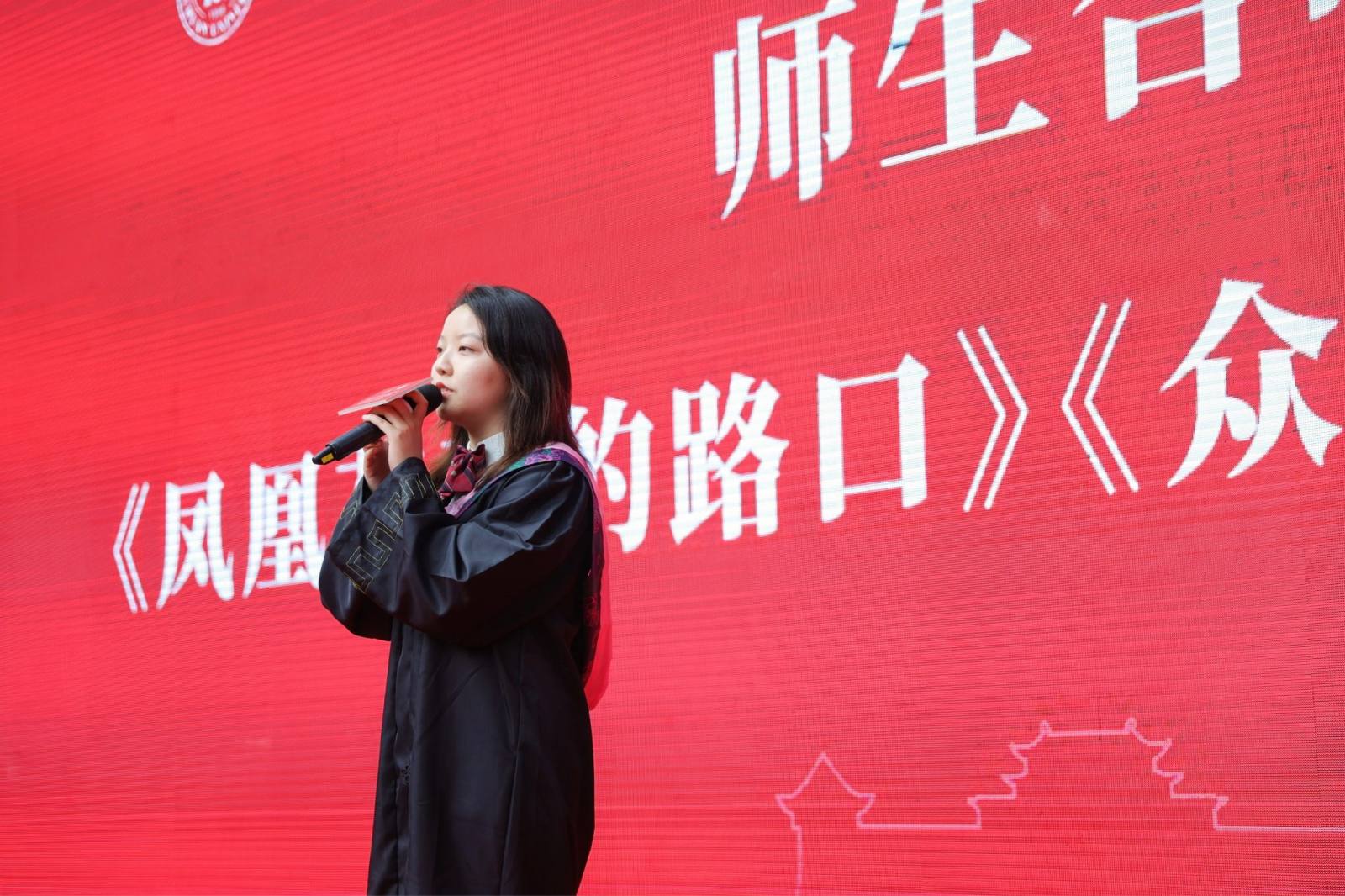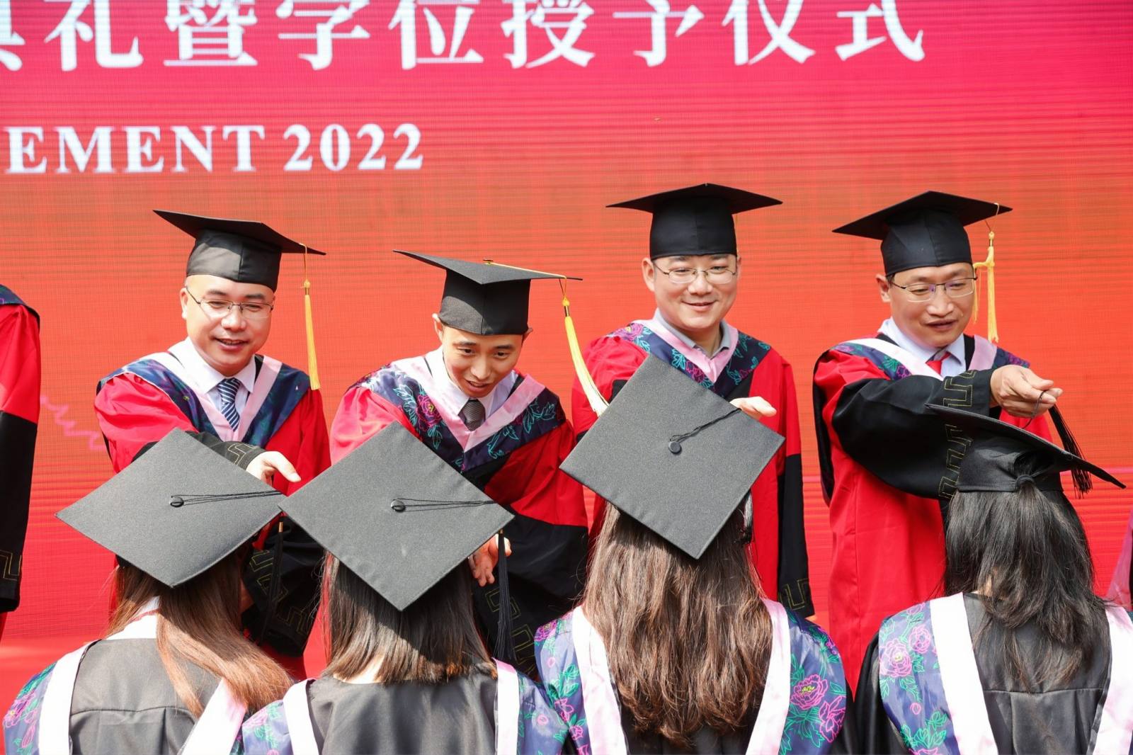 在师生联唱环节中,2022届本科毕业生高源同学领唱的《凤凰花开的路口》将毕业生的不舍之情展现得淋漓尽致,王谦教授与老师们合唱的《众人划桨开大船》表达了全体老师们齐心协力把同学们培养成卓越人才、师生们戮力同心把学院建设得更美好的心愿。最后,各专业老师依次为毕业生拨穗授位并合影留念。