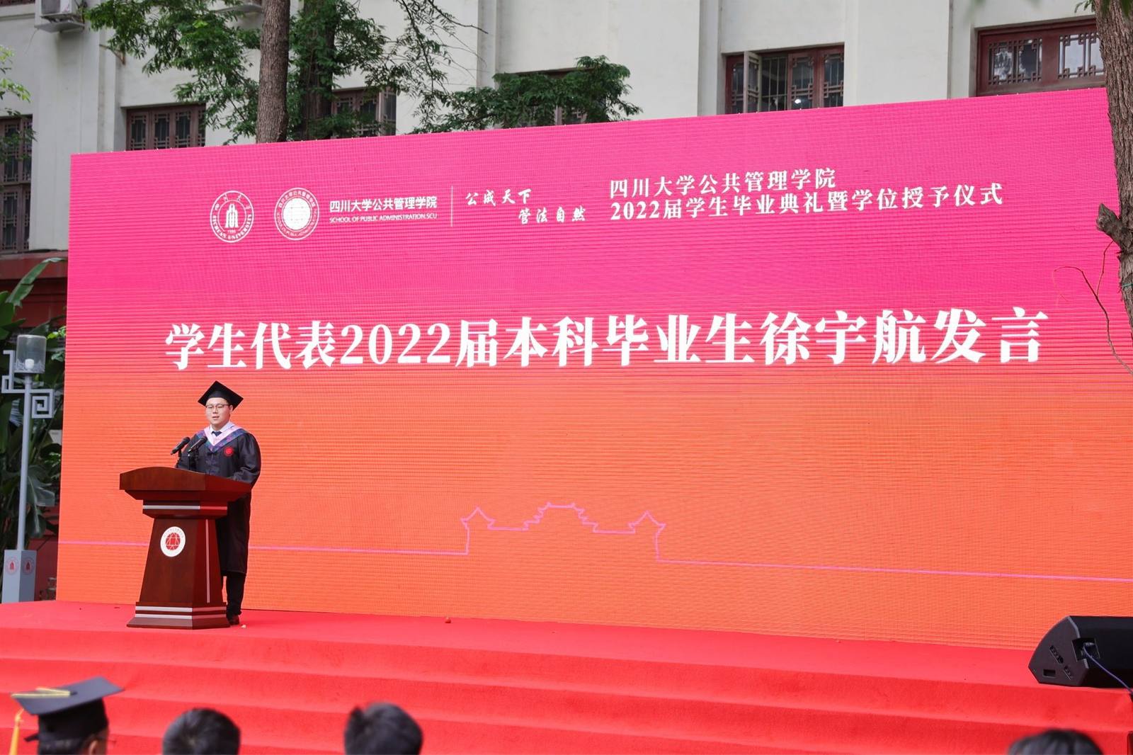 学生代表2022届本科毕业生徐宇航同学在发言中感恩学院的培养、老师的教诲、同学的陪伴,表示将记住老师们的嘱咐,并将“公成天下,管法自然”的院训撒播四方。校友代表、中共成都市委办公厅会议处处长、2013届MPA毕业生邓冰梅在发言中祝贺学弟学妹们顺利毕业,并以自己的成长经历鼓励学弟学妹在奔往人生新征程中不怕苦累、勇敢前行。