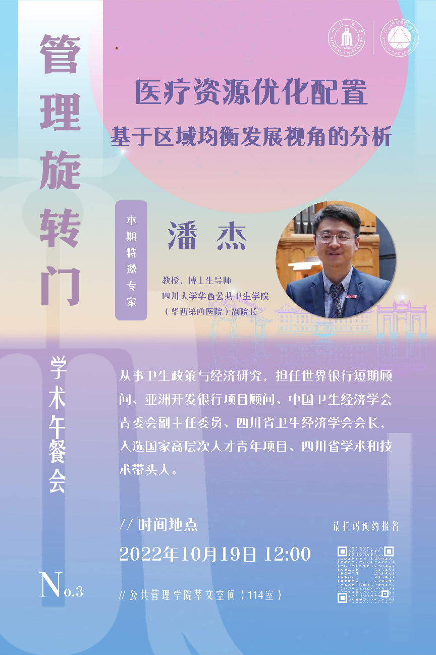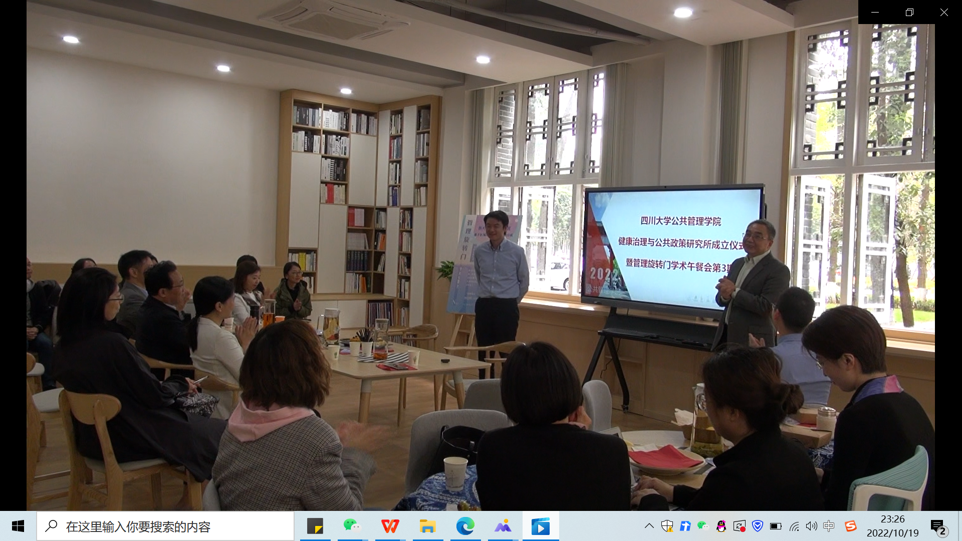 2022年10月19日,williamhill体育在线登录健康治理与公共政策研究所成立仪式和第3期“管理旋转门”学术沙龙在学院共享空间(萃文空间)举行。本次活动特邀华西公共卫生学院(华西第四医院)副院长、博士生导师潘杰教授作为主讲嘉宾,学院各系老师积极参加了此次学术活动。