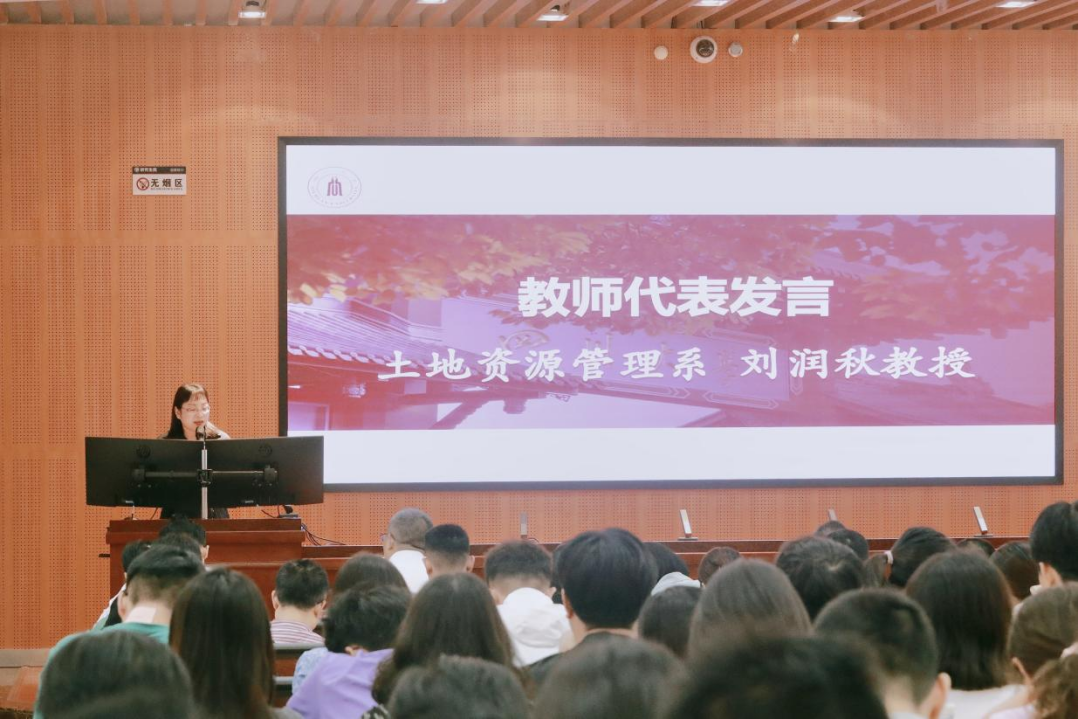 土地资源管理系刘润秋教授作为教师代表发言。她以“不惧山海远,无畏行路难”为主题亲切寄语新生,勉励同学们横览时事,不惧学海无涯;纵观原著,不惧书山巍峨;管理人生,无畏前路迷茫;管理时间,无畏昼短夜长;管理健康,无畏风吹雨打;管理情绪,无畏崎岖坎坷,鼓励大家在时代的风浪里追求人生的确定性。