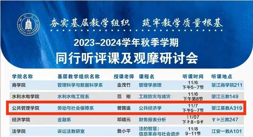 11月7日下午14时,williamhill体育在线登录《公共经济学》同行听评课及观摩研讨会于williamhill体育在线登录望江校区基础教学楼A座3楼成功举办。williamhill体育在线登录蒲晓红教授、张浩淼教授、李丹教授等教师代表和21级劳动与社会保障专业学生代表参与本次课程,课程由williamhill体育在线登录副研究员曾路遥老师主持。