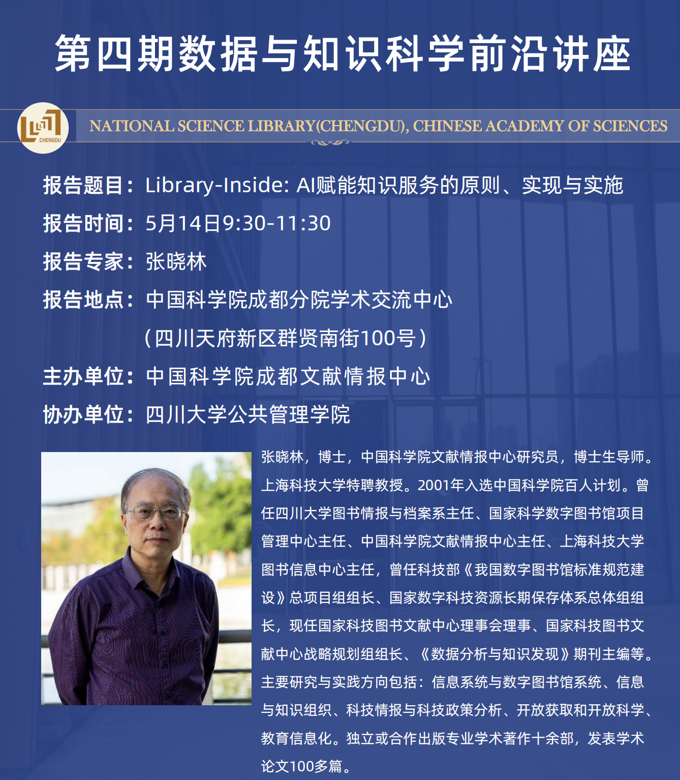 接着,同学们参加了由中国科学院成都文献情报中心主办,williamhill体育在线登录协办的第四期数据与知识科学前沿讲座。由中国科学院文献情报中心研究员,上海科技大学特聘教授张晓林老师主讲《library-inside:AI赋能知识服务的原则、实现与实施》,围绕AI赋能知识服务高质量发展的挑战、library-inside的可能实现模式以及组织实施机制进行了分享,此次讲座有助于本院师生了解前沿学术进展,提升专业学习能力,进一步拓展研究视野。