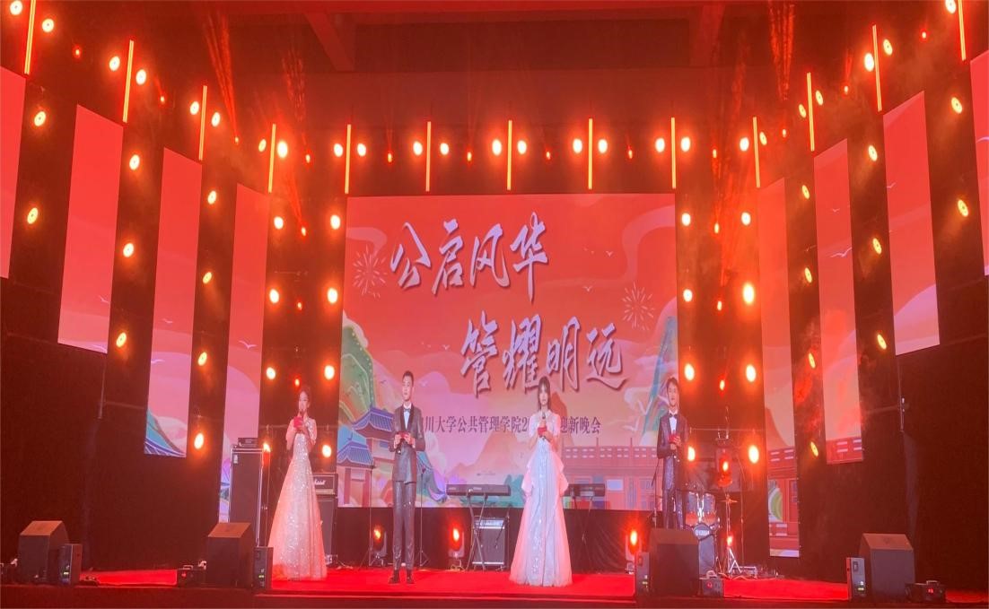 “筑梦起航”篇章吟诵《华夏颂歌》、舞跃《如梦令》,唱响京剧《飞虎山》选段,带领观众领略山河壮美,体味传统文化魅力,“公成天下,管法自然”院训在此形成共鸣。歌曲《芙蓉蔷薇夜·刀马梦回时》告诉同学们在成都、在川大公管可以乘风破浪的可能,为晚会画上了圆满句号。