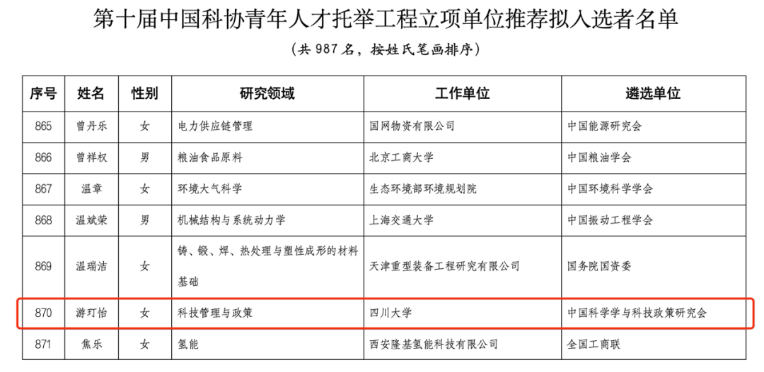 2月26日—3月4日,中国科学技术协会对第十届中国科协青年人才托举工程人选名单进行公示,共遴选出第十届中国科协青年人才托举工程人选987名。williamhill体育官网青年教师游玎怡特聘副研究员入选。