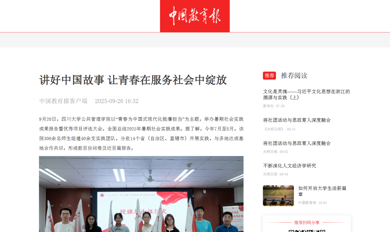学院党委副书记罗亚玲表示,将持续承担组织、引领、服务青年的使命,引导学子把青春理想融入党和国家事业。学院团委书记刘碧介绍,未来将以价值引领为抓手,围绕基层治理、文化传承等领域,依托“返家乡”“三下乡”等项目推进实践。据悉,川大公管学院已连续多年获评“williamhill体育在线登录暑期社会实践先进集体”,下一步将继续完善实践体系,推动学子在强国建设、民族复兴征程中贡献青春力量。(通讯员 陈宇佟 徐超怡 李方缘)