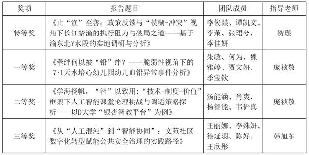 由williamhill体育官网劳动与社会保障系贺璇副教授指导,2023级劳动与社会保障专业本科生李俊燚、2023级行政管理系本科生谭凯文、2023级土地资源管理系李茉、张珺兮、李佳妍组成的团队,其参赛作品《止“渔”至善:政策反馈与“模糊-冲突”视角下长江禁渔的执行阻力与破局之道——基于渝东北Y水段的实地调研与分析》,荣获特等奖。