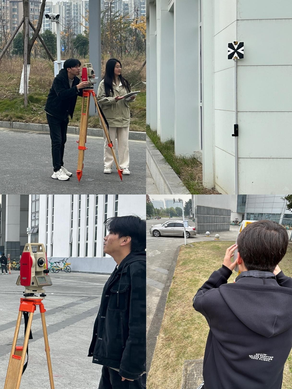 中午十二时许,各组同学齐聚文科楼三区205教室。朱红波老师强调操作规范与安全事项后,各小组有序领取测绘仪器,迅速奔赴测量区域。尽管天气寒冷,同学们依然严谨投入、分工明确,从控制点的选取,到碎部点的细致测量,每一步都力求精准。