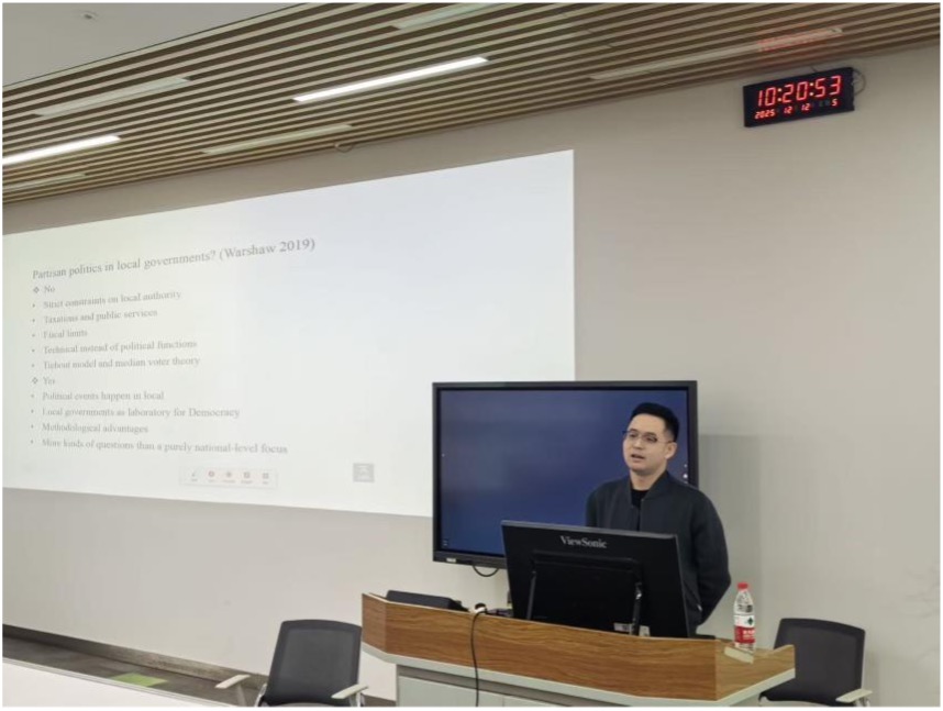 在具体研究内容的展开中,魏文池副教授重点围绕两项核心准实验研究,详细介绍了他的研究总体逻辑脉络和分析过程,阐述了两项研究的核心假设、框架设计、数据来源的筛选标准及量化分析方法,通过严谨的逻辑推演与数据论证,清晰呈现了党派政治对政府预算分配倾向、支出效率及政策落地效果的影响路径和实际效应。此外,他还结合典型案例,深入解读研究结论背后蕴含的政策内涵,指出党派立场差异对预算资源配置的潜在影响,为同学们理解政府预算治理的复杂性提供了全新视角。
