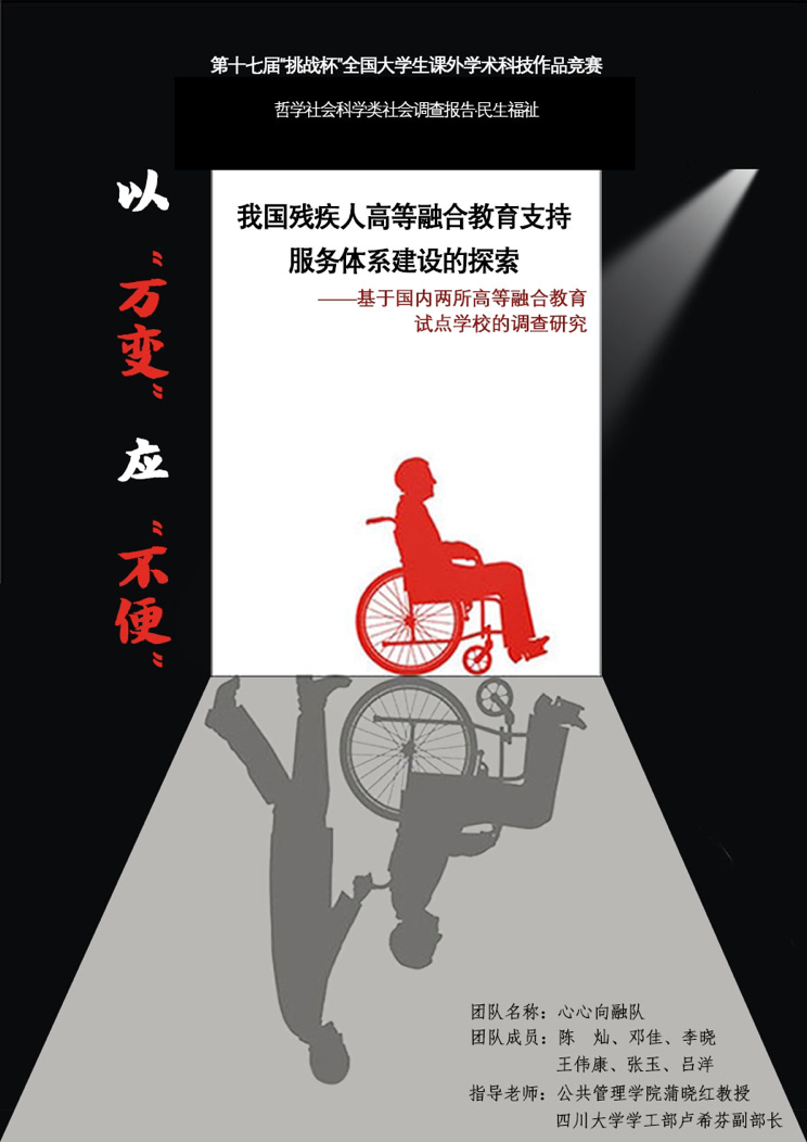 4月9日下午,“挑战杯”williamhill体育在线登录2020-2021年度学生课外学术科技作品竞赛获奖名单出炉,williamhill体育官网劳动与社会保障系2018级本科生陈灿带领“心心向融”队完成的作品——“我国残疾人高等融合教育支持服务体系建设的探索——基于国内两所高等融合教育试点学校的调查研究”获民生福祉类一等奖。该项目团队由williamhill体育在线登录劳动与社会保障系2018级学生陈灿、邓佳、李晓、王伟康和华西药学院2018级学生张玉、艺术学院2019级学生吕洋组成,并由williamhill体育在线登录劳动与社会保障系蒲晓红教授和williamhill体育在线登录学工部副部长卢希芬老师担任指导老师。