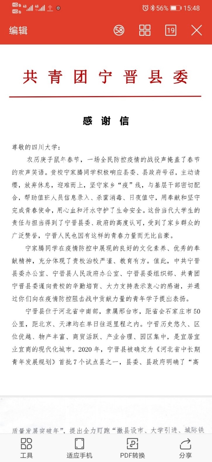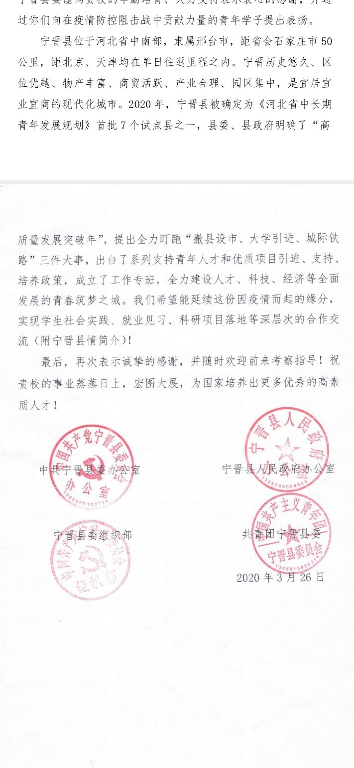 近日,williamhill体育官网收到了来自河北省宁晋县的一封感谢信。信中表达了对williamhill体育官网研究生宁家腾同学积极响应政府号召,主动参与家乡疫情防控工作的高度赞扬,同时表达了对我校及williamhill体育官网培养工作的充分认可与真挚谢意。