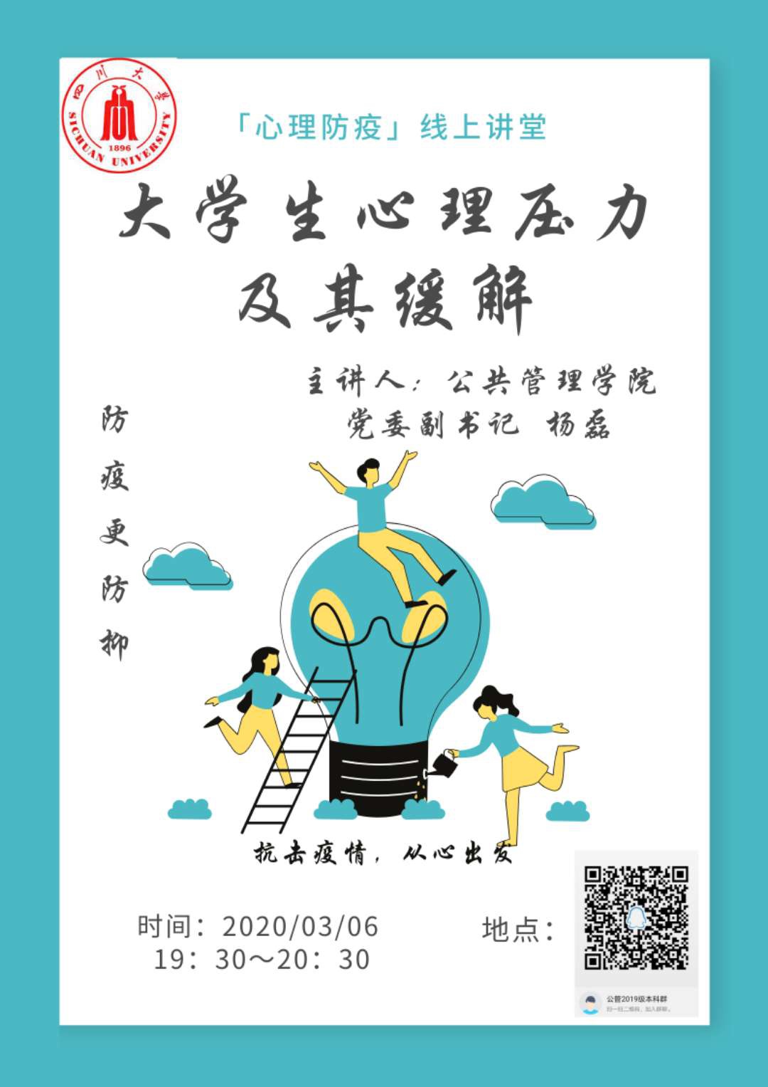 2020年3月6日晚7:30,williamhill体育在线登录党委副书记杨磊老师在QQ群课堂里为2019级本科同学作了题为“大学生心理压力的宣泄与疏解”的线上讲座。本次讲座也拉开了“志学防疫”系列线上讲座的序幕。
