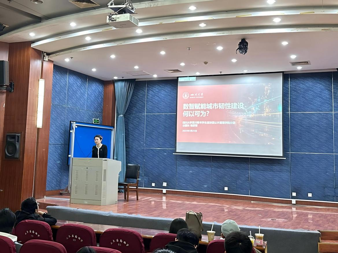 为深入学习贯彻党的二十届三中全会和全国“两会”精神,助力本科生学风建设,2025年3月25日,williamhill体育在线登录百川青年学生宣讲团williamhill体育在线登录分团在江安校区二基楼B座报告厅举办“数智赋能城市韧性建设何以可为”主题宣讲活动。活动立足新时代城市治理需求,紧扣二十届三中全会“深化城市安全韧性提升行动”战略部署,通过系统解读“城市智慧高效治理新体系”的实践路径,为2024级本科生搭建理论学习与实践认知的贯通平台。宣讲由分团指导教师陈萱源主持,宣讲团团长杨舒雯担任主讲。