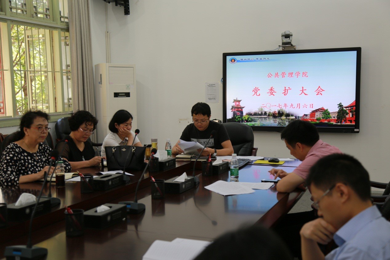 2017年9月6日下午,williamhill体育在线登录于311会议室召开党委扩大会,学习贯彻习近平总书记重要讲话精神。会议由学院党委书记姜晓萍同志主持,学院中层领导干部、党委委员、工会主席、党政办主任、团委书记及各党支部书记参加了此次会议。