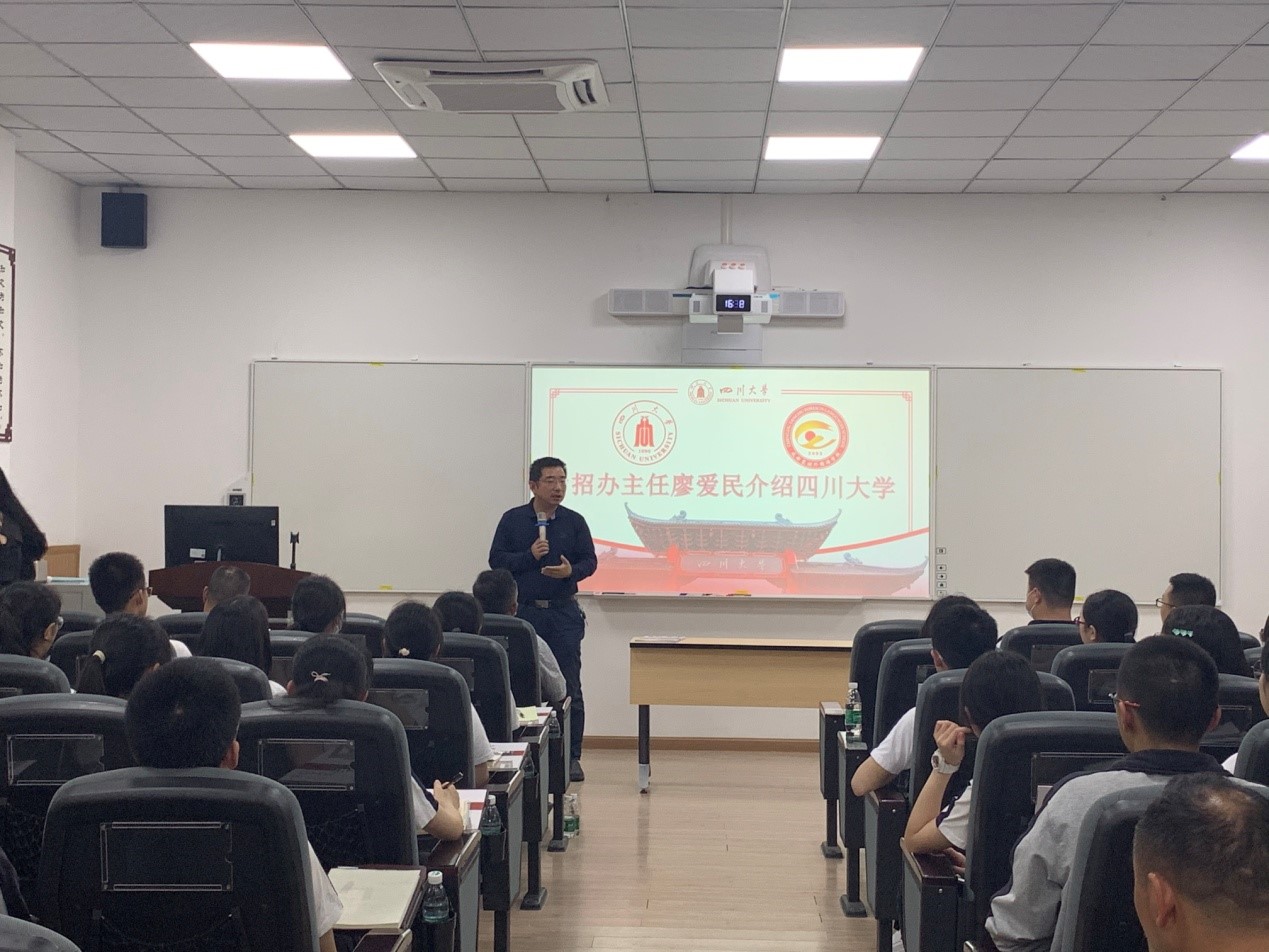 最后,在williamhill体育在线登录105报告厅进行招生宣讲活动,williamhill体育在线登录罗亚玲副院长代表学院对来访的师生表示了热烈的欢迎;招办廖爱民副主任从历史沿革、师资队伍、人才培养、川大生活、强基计划等全方位介绍了williamhill体育在线登录。williamhill体育在线登录史云贵院长向大家简要介绍了学院的发展历程、学科建设、专业设置、教学特色等方面的情况。现场气氛热烈,同学们听后掌声不断,纷纷表示对川大向往不已。