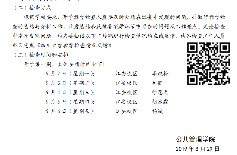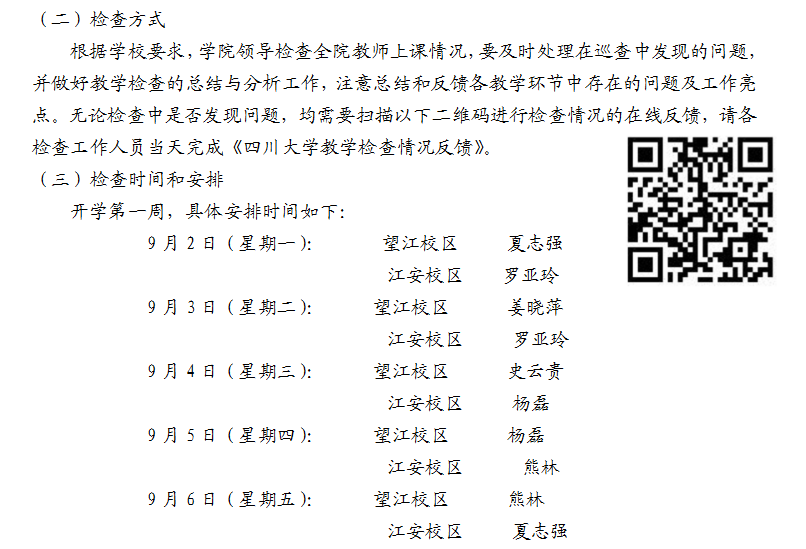 1、学院制定开学教学检查一周工作安排表,做到望江、江安两个校区全覆盖,并将开学教学检查责任落实到个人,全院正副职院领导、本科教学督导组成员、本科教务秘书等参与检查。党委书记姜晓萍、院长史云贵、副书记杨磊、副院长夏志强、副院长熊林、副院长罗亚玲,本科教学督导组胡冰霜、徐恩元、杨斌、李晓梅等老师以及本科教务秘书林熙老师对新学期的课程安排与上课情况进行了检查。