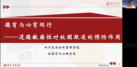 为了将研究结果反馈给一线教师,并推动校园欺凌干预课程的开发工作,4月16日,项目组召开了“德育与心育同行:道德敏感性对校园欺凌的预防作用”线上研讨会,校园欺凌领域专家、中小学校长及教师等约50人参会。刘传军老师对四川省社会科学“十四五”规划2021年度项目的资助、williamhill体育在线登录自主科研计划的支持,以及参与本次调研的专家及一线教师致以谢意后,应用心理硕士生谢忠桔对调研的基本过程与结果进行了总结汇报。在随后的自由讨论环节,沈潘艳副教授根据自身课程设计经验,提出可以从学生的认知失调、情绪觉察能力方面入手,引导学生关注受害者被欺凌时的具体情况以及由此带来的痛苦,以增加其对受害者的帮助行为。一线心理健康教师代表、来自天府四中的蔡倩老师,结合实务经历指出,一方面,欺凌相关的校园情景剧以及权威人士对欺凌法律责任的普及可能对反欺凌起到一定推动作用,而另一方面,为学生明确欺凌定义可能起到反作用,如“欺凌”一词可能成为学生之间取笑的工具,因此,反欺凌课程的设计中诸多细节不容忽视。