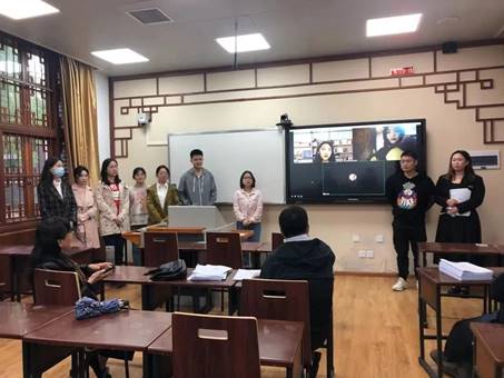 在节目表演环节。同学们表演了情景舞蹈《我在这儿等着你回来》,极富爱心和家国情怀的表演掀起了师生见面会的高潮;琵琶与二胡等乐器完成《青花瓷》等节目,乐声动听;歌曲《Our Song》《世界上的另一个我》美妙动听、活泼清新,令大家沉浸其中。老师与同学的互动环节中,廖登峰、史露淋同学与兰旭凌老师和刘超老师合唱歌曲《这世界那么多人》,在动听的歌声中,师生间的距离渐渐拉近;“传声筒”、“谁是卧底”等游戏与其他节目大都由老师和同学合作完成,充满了智慧与乐趣,同学与老师们都乐在其中。