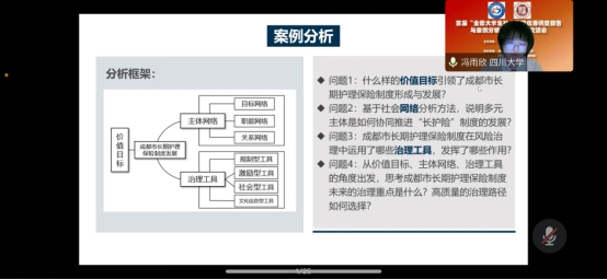 williamhill体育官网社会保障专业研究生冯雨欣、孙梁悦、陈晨玉、李丽婷组成长期护理保险调研小组,在沙治慧教授的指导下,针对成都市长期护理保险制度展开了一系列调查研究,以期还原成都市“长护险”制度的发展进路,提炼制度建设与治理模式的内在逻辑,为日后长护险制度在全国普及推广提供经验借鉴,最终形成《如何铸就失能老人幸福之路:成都市“长护险”制度发展进路和治理逻辑深描》案例分析报告,并在线上成果交流会上进行分享。汇报完后,专家老师针对报告内容提出了宝贵的意见与建议,指引小组成员开展后期更为深入的研究。