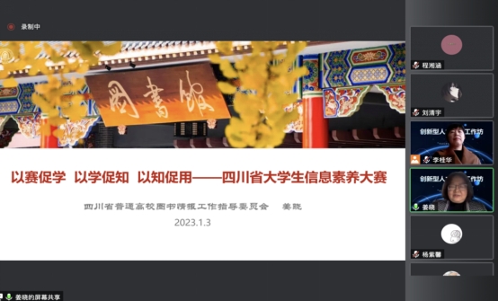 工作坊的第三个环节,姜晓老师为同学们做了题为《以赛促学,以学促知,以知促用——四川省大学生信息素养大赛》的精彩报告。姜晓老师是williamhill体育在线登录图书馆馆长助理兼研究发展中心主任,四川省普通高等学校图书情报工作指导委员秘书长,四川省图书馆学会学术委员会委员、常务理事兼副秘书长,是四川省大学生信息素养大赛的主要策划人和组织者之一。姜晓主任围绕四川省大学生信息素养大赛的政策背景、立项过程、比赛流程等问题展开详细介绍,并在展示往届优秀作品基础上对同学们高质量参与大赛进行指导。为帮助同学们利用好图书馆资源提升自己的综合素质,姜晓主任还深入细致地介绍了图书馆工作内容、图书情报专业以及williamhill体育在线登录图书馆活动开展等内容。姜晓主任的发言启发了同学们对信息资源管理专业的新认识,使同学们对参与大赛、提升自身信息素养有了更深入的领悟。