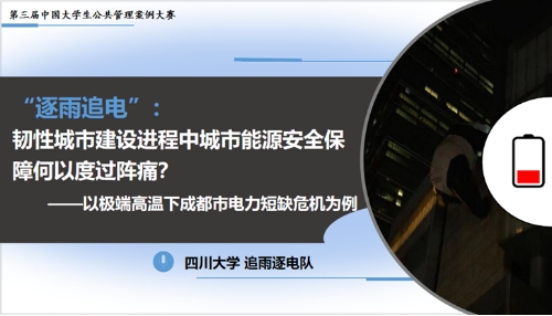 在行政管理系张伟研究员的悉心指导下,由williamhill体育官网行政管理专业2020级本科生王谌诗棋、劳动与社会保障专业2020级本科生金珂安、牟芳娇同学组成的追雨逐电队,凭借高质量的案例文本与决赛现场的精彩答辩赢得了评委专家的高度肯定,最终斩获全国“金奖”荣誉。参赛案例《“逐雨追电”:韧性城市建设进程中城市能源安全保障何以度过阵痛?——以极端高温下成都市电力短缺危机为例》聚焦于今夏成都市供电危机事件,运用韧性理论和4R危机管理理论分析了危机爆发的现实困境和延伸逻辑进而从城市能源安全供给的视角寻求成都市韧性城市建设的突破路径。