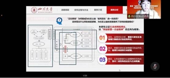 由williamhill体育官网劳动与社会保障系沙治慧教授指导的《如何铸就失能老人幸福之路:成都市“长护险”制度发展进路和治理逻辑深描》以及由行政管理系李强彬教授指导的《“联”出余热,“益”起共担:“五社联动”以唤醒社区公益——以成都市“天府社区食物银行”为例》两部作品入选此次活动优秀案例分析报告,并于12月10日参加线上成果交流会,共论研究问题,共享研究成果。