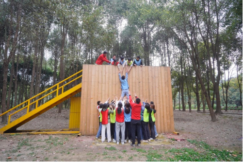 团队展示环节之后,共有“高空断桥”、“极速拼接”、“争分夺秒”、“毕业墙”四项活动。在“高空断桥”活动中,每位同学需要独自走上8米高的“断桥”进行跨越,通过互相加油助力,同学们增强了挑战自我得到的勇气和快速适应的能力。在“极速拼接”游戏中,三个小组在组内自行分为指挥组和操作组,通过紧密配合、快速操作,均成功将16根不规则木条按照图纸拼接完成。在“争分夺秒”游戏中,同学们以小组为单位首先将图片代表的数字解密,再在规定时间内按照顺序正确排列,获得了教练团队的连连肯定。在攀登“毕业墙”的过程中,同学们齐心协力搭建“人梯”,在不借助其他工具的情况下成功翻越一堵4米高的墙壁,更加深刻地体会到了团队信任、拼搏尝试的力量。