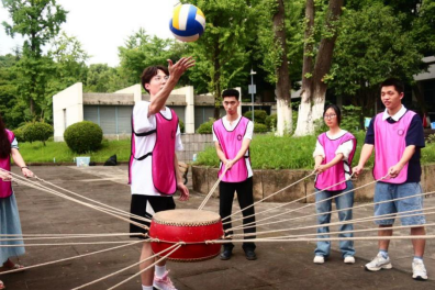 “鼓动人心”环节则进一步考验团队的协调性。小组每位成员手持系在鼓边缘的绳索,通过默契配合控制鼓面,使球在鼓面上持续弹跳,大家相互鼓励、相互支持,在挑战中体会到了团队协作的力量。